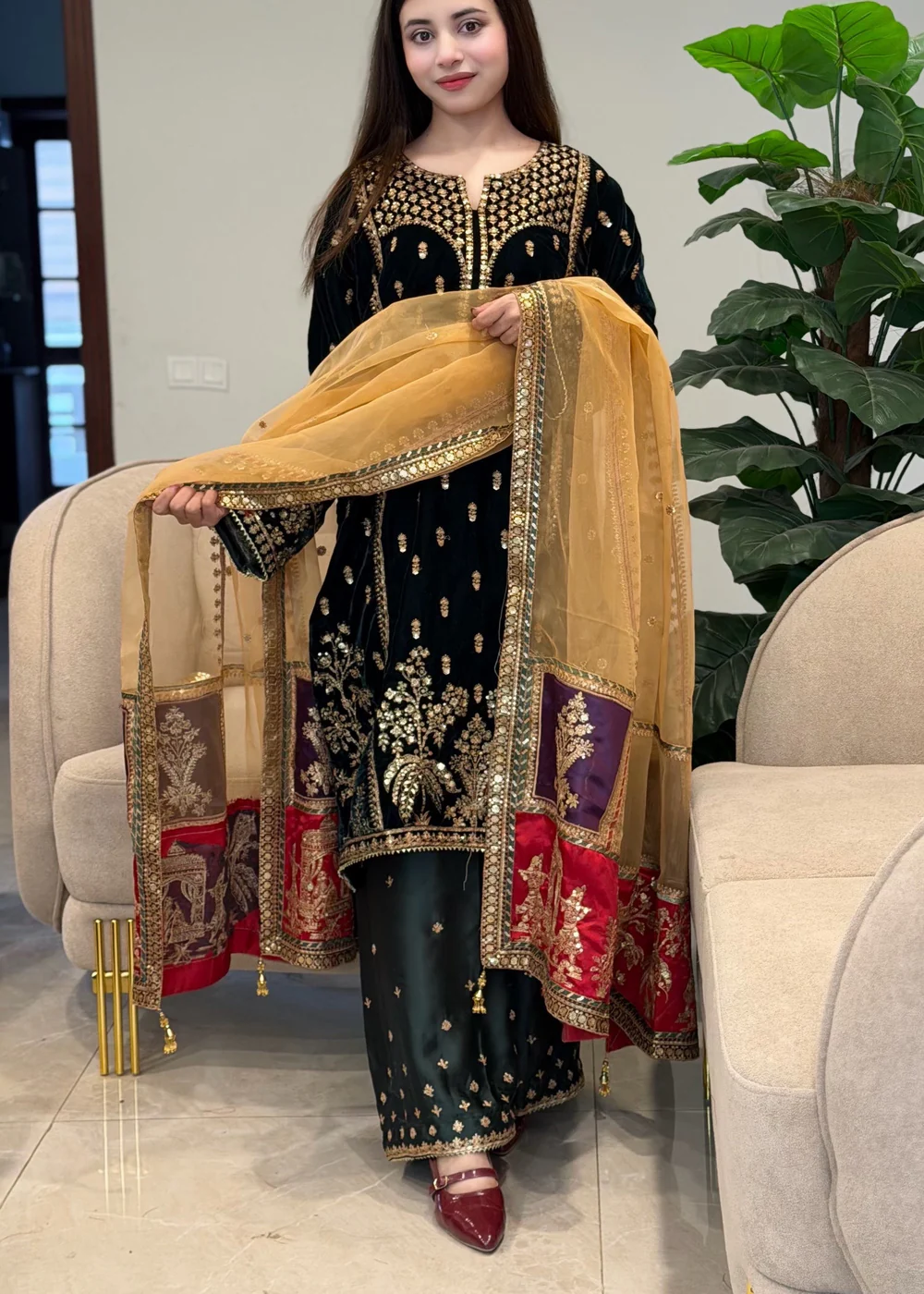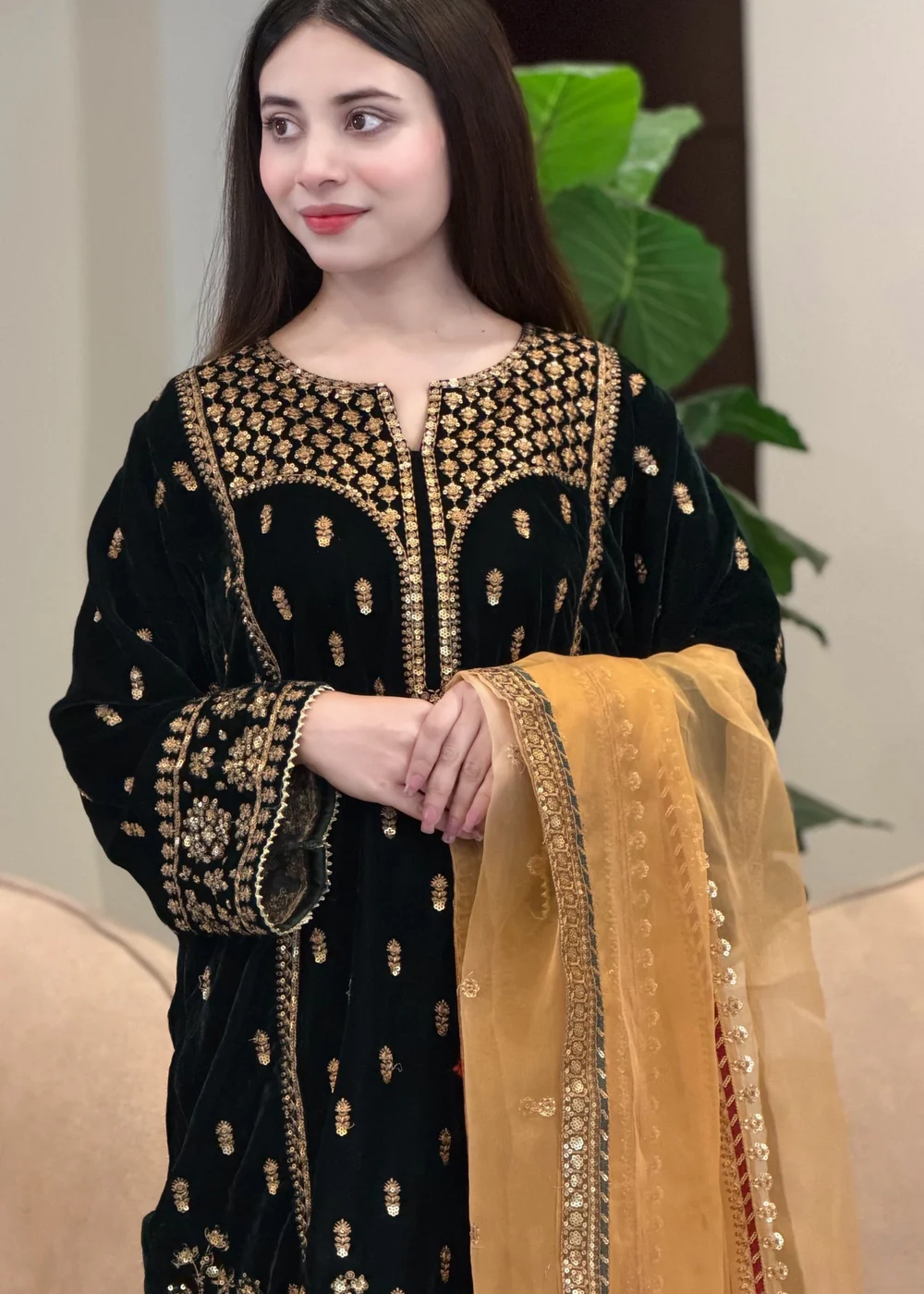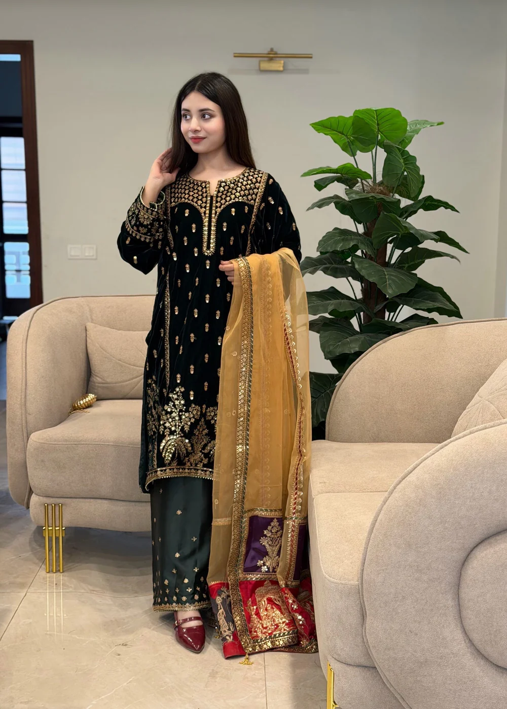This exquisite Festive/Party Wear Kurta Set features a luxurious Velvet top in a stunning Teal color. The Straight Cut Kurta is embellished with intricate details, complemented by Silk trousers and an Organza dupatta. Perfect for winter wear, this 3-piece ensemble exudes elegance. Medium size model shoot dress.From Suits By Sadia.